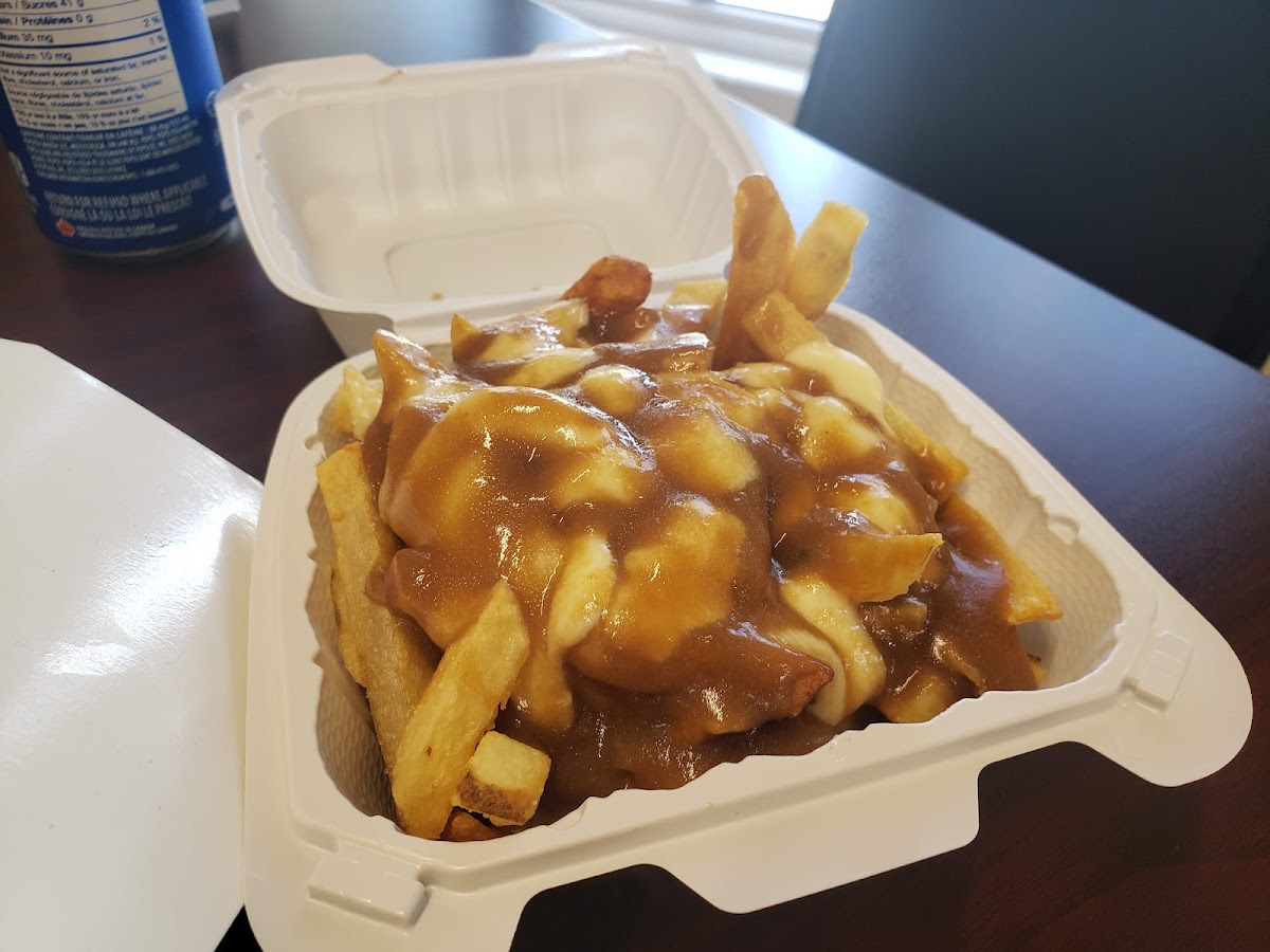 Great quick stop for food. There are many options besides poutin. Clean bathroom and very large gravel parking lot if you have a large vehicle or RV. Food was decent diner food. Lots of treats and candy for the kids. Great location off the transcanada, close to the superstore and Walmart. Large eating area outside so great if you have a dog. Huge cheesecake menu as well...which was tempting but portions of the meals are large, so no room left!
